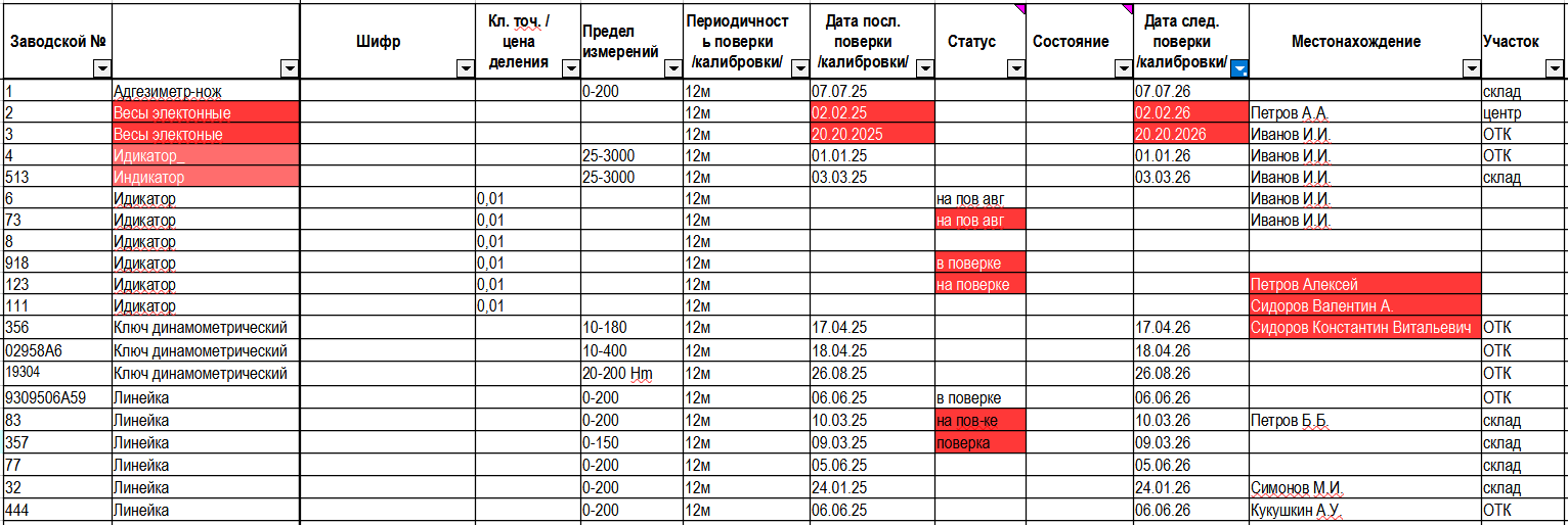 - Неединообразный формат дат и статусов (например, 12/02/2026 и 2026/12/02, «в поверке/на поверке»).