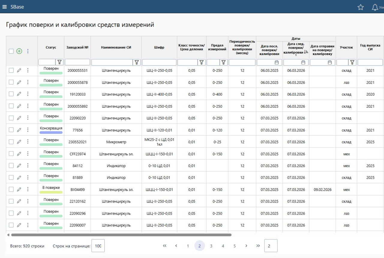 Для настройки системы завод предоставил действующую структуру таблиц и параметры учёта. Это позволило перенести привычный график поверки/калибровки в SBase без изменения логики работы сотрудников, обеспечив комфортный переход на новый цифровой формат.