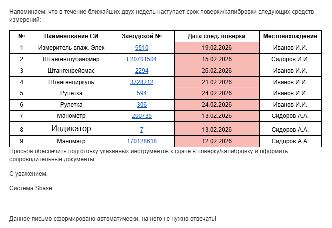 - Контроль сроков и автоматизация отчётов. Вместо ручного выставления дат в системе достаточно задать периодичность поверки для каждого инструмента. SBase автоматически подсвечивает приближающиеся даты и за две недели направляет ответственным лицам отчёты-напоминания. При этом отчеты формируются на платформе автоматически и содержат всю необходимую информацию для идентификации нужных СИ. Ниже приведем пример автоматически сформированного письма о приближении срока поверки/калибровки.